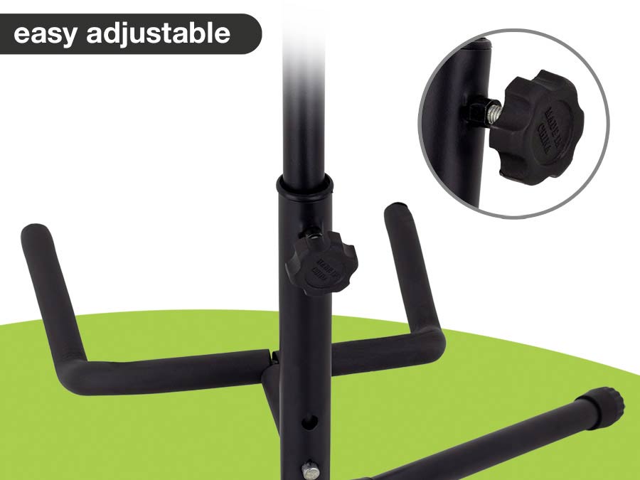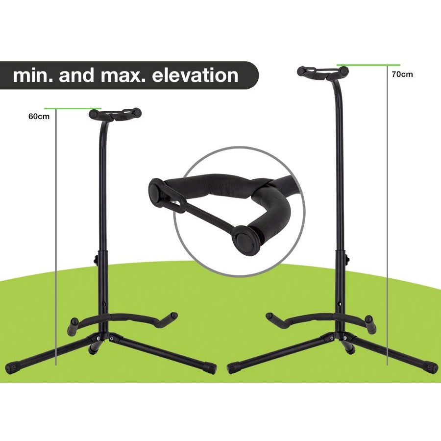 Realizat din metal rezistent și finisat în negru elegant, standul este reglabil pe înălțime și dispune de zone de contact cauciucate, care protejează finisajul chitarei împotriva zgârieturilor. Sprijinul suplimentar pentru gât oferă un plus de securitate, în special în medii unde instrumentele sunt expuse riscului de lovire sau dezechilibru.