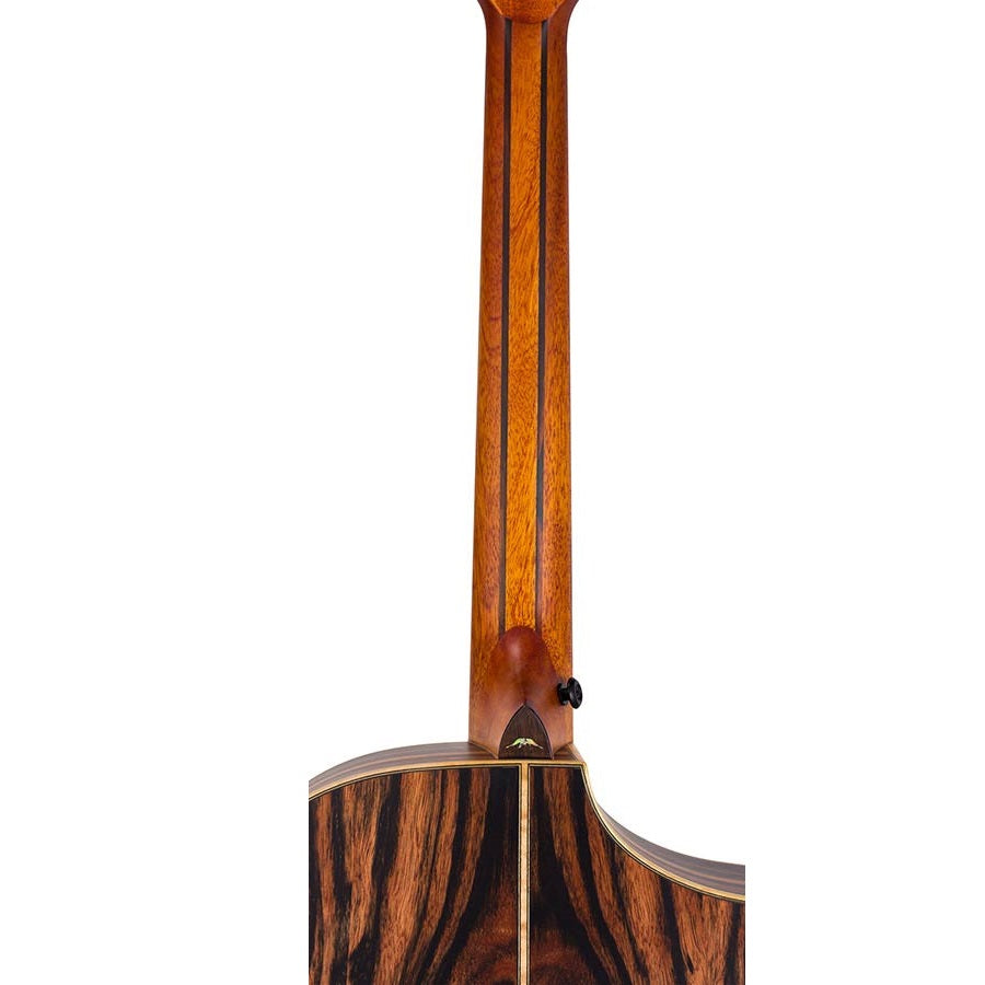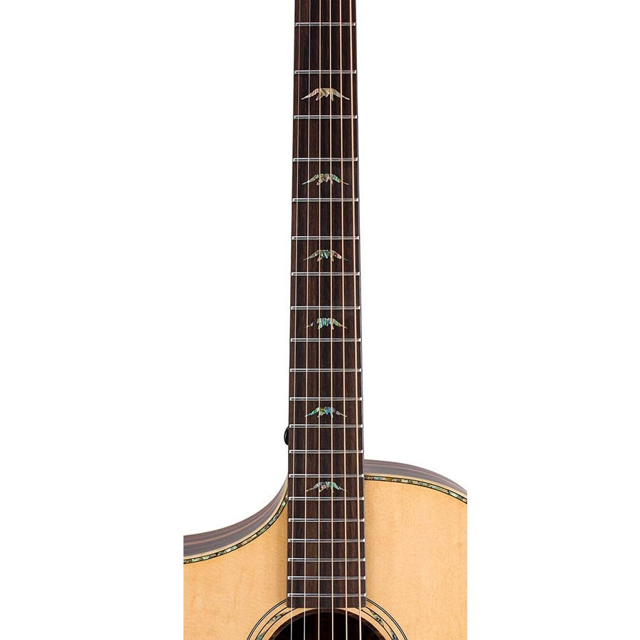 Gâtul din mahon, întărit cu două benzi din Amara ebony, asigură stabilitate și confort, iar tastiera din același lemn exotic oferă o senzație moale și precisă la atingere. Elementele decorative – rozeta „Cowboy Rope” din abalon, marcajele Mt. Bromo și detaliile din arțar flamed – conferă instrumentului o estetică elegantă, specifică seriei Rocky Mountain.
