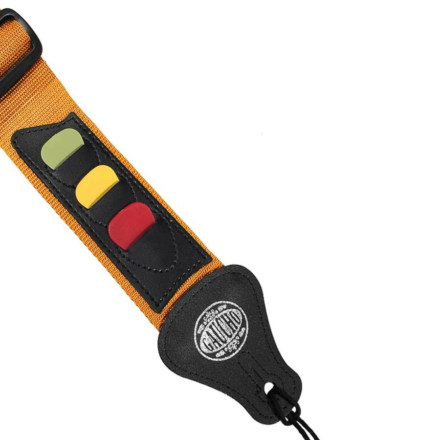 Gaucho GST-55-YE curea cu 3 pene, pentru chitară clasică, acustica, electrică, bass, ukulele, mandolină, la un preț atractiv. Cureaua este echipată cu 3 suporturi elastice integrate pentru pene, aliniate discret pe lungimea curelei pentru acces rapid în timpul cântatului. Material nylon, 5 cm lățime, reglabilă 85–150 cm.
