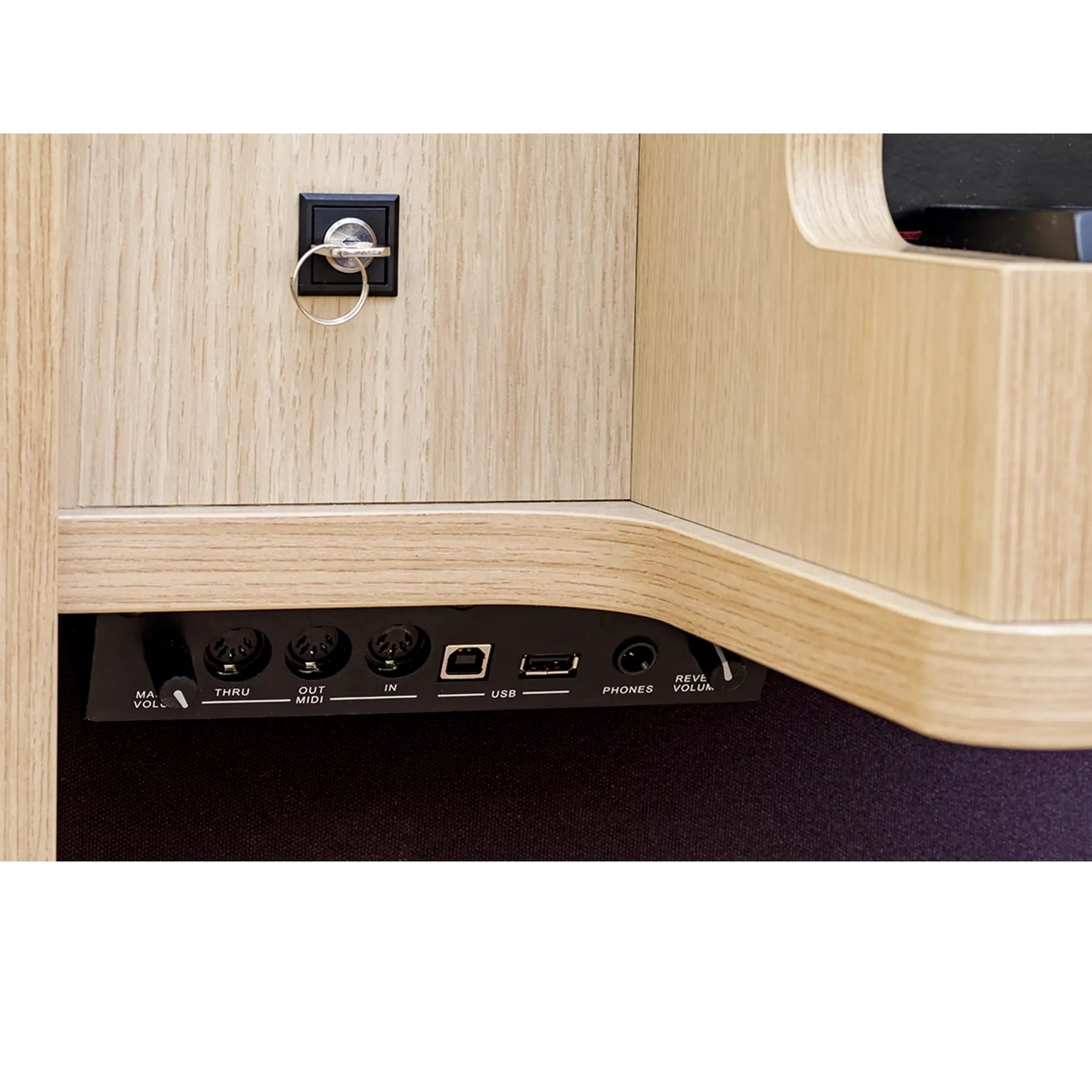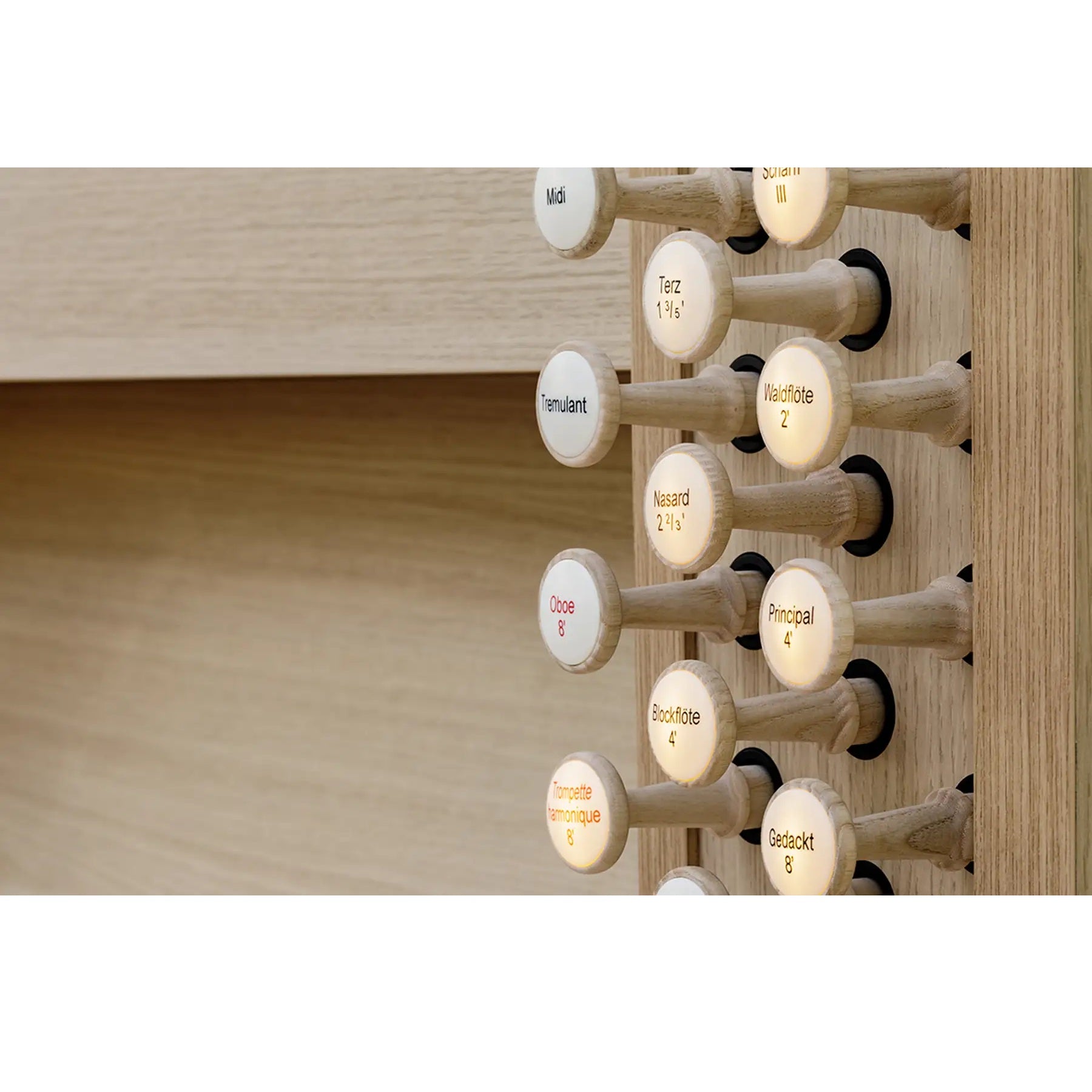 Dispunerea comenzilor este atent gândită pentru o utilizare confortabilă și precisă. Comenzile pentru activarea registrelor sunt amplasate ergonomic și răspund instantaneu la atingere, iar afișajul lateral integrează un panou de control sobru și elegant, care permite accesul rapid la numeroase funcții personalizabile. Toate acestea contribuie la o experiență intuitivă și plăcută, potrivită atât pentru repetiții, cât și pentru interpretări publice.