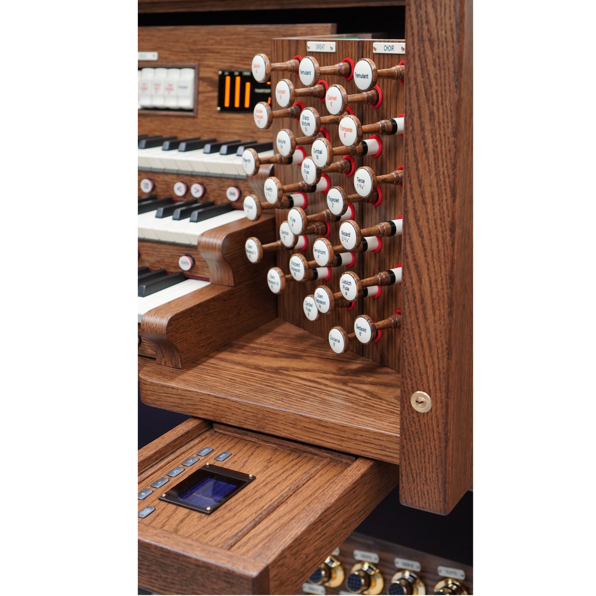 Opera 450 include toate seturile de tuburi actualizate Viscount, complet personalizabile, precum și posibilitatea de a adăuga voci orchestrale suplimentare. Comenzile ergonomice – drawknob-uri, thumb pistons și butoane de acces rapid – sunt poziționate intuitiv pentru o operare fluidă și precisă. Ecranul lateral dedicat, împreună cu comenzile specifice, asigură o experiență de control intuitivă și flexibilă.